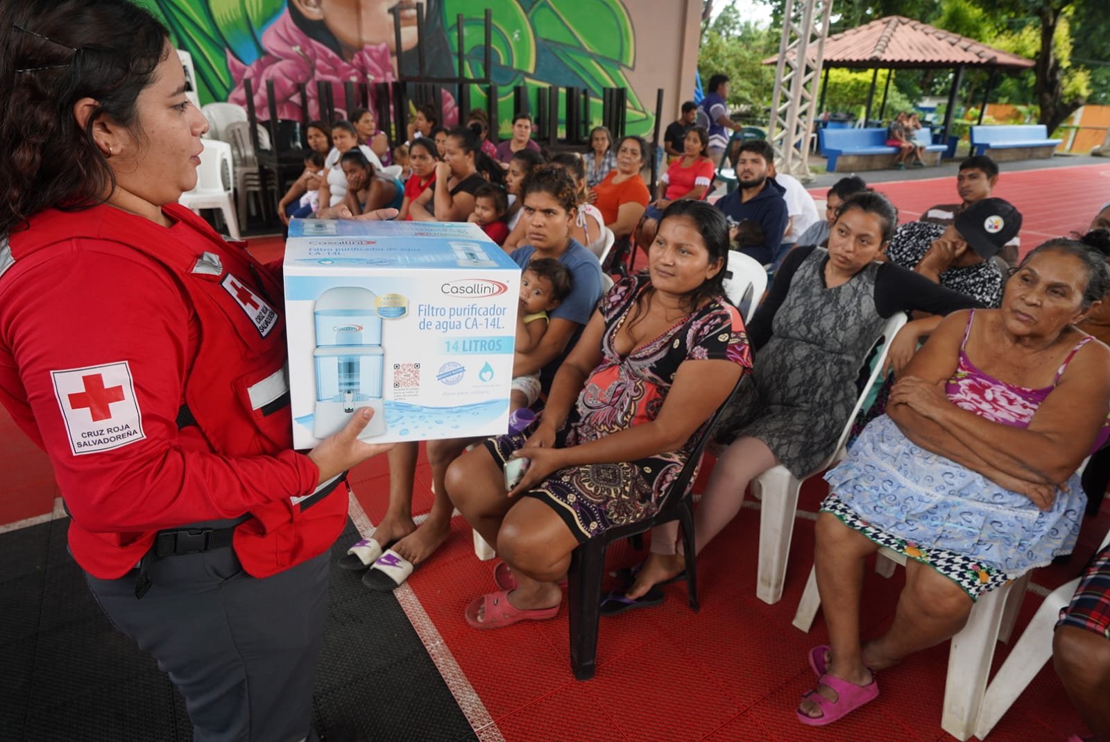 El Salvador – Cruz Roja Salvadoreña entregó asistencia humanitaria a 42 familias albergadas en el alojamiento temporal Complejo Deportivo 27 de septiembre ubicado en el distrito de Zacatecoluca, municipio de La Paz Este.