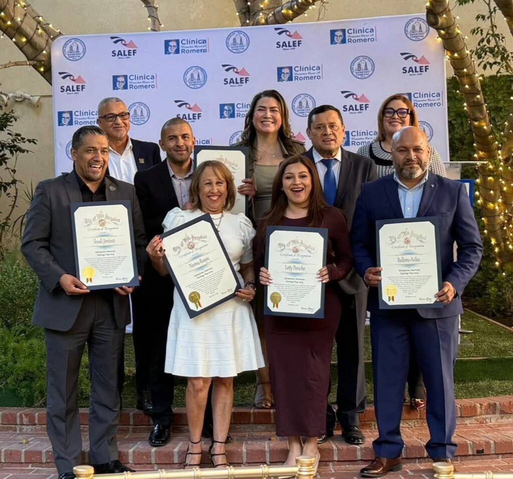 Los Ángeles-California-La Alcaldía de Los Ángeles inició la conmemoración del Día de la Herencia Salvadoreña-Americana iluminando su edificio con los colores azul y blanco de El Salvador. Como parte de la celebración, este 5 de diciembre se reconoció a seis profesionales salvadoreños de medios de comunicación locales de prensa escrita, televisión y radio entre se destacan a Soudi Jiménez de (Los Ángeles Time), Eddie One (Mega 96.3 FM), Antonio Ayala de (Hola El Salvador USA), Norma Roque de (Univision), Balbino Avilés de (Telemundo) y Letty Peniche de radio (Power 106) por representar en su trabajo a toda la comunidad salvadoreña-Americana.