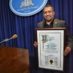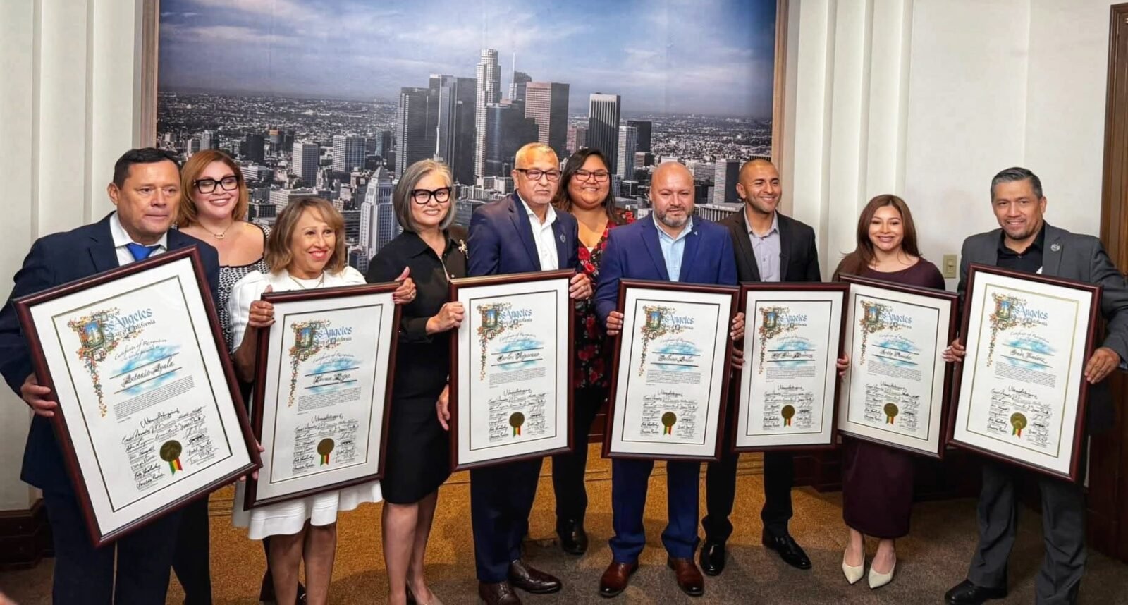 Los Ángeles-California-La Alcaldía de Los Ángeles inició la conmemoración del Día de la Herencia Salvadoreña-Americana iluminando su edificio con los colores azul y blanco de El Salvador. Como parte de la celebración, este 5 de diciembre se reconoció a seis profesionales salvadoreños de medios de comunicación locales de prensa escrita, televisión y radio entre se destacan a Soudi Jiménez de (Los Ángeles Time), Eddie One (Mega 96.3 FM), Antonio Ayala de (Hola El Salvador USA), Norma Roque de (Univision), Balbino Avilés de (Telemundo) y Letty Peniche de radio (Power 106) por representar en su trabajo a toda la comunidad salvadoreña-Americana.