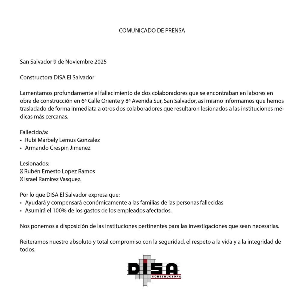 En un comunicado de prensa, la empresa encargada de la obra, tras lamentar el accidente, se comprometa a indemnizar a las familias de las victimas y estar en disposición de cualquier investigación de parte de las autoridades.