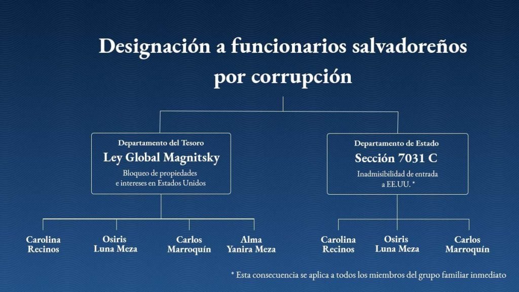 Anteriormente, la misma entidad gubernamental estadounidense acusó al director del Tejido Social, Carlos Marroquín, al director de Centros Penales, Osiris Luna, de: “negociar con las pandillas para que los números de homicidios no se elevaran a cambio, obtuvieron beneficios como dinero y prostitutas”. Mientras que el 21 de septiembre de este año, 19 personas salvadoreñas fueron incluidas en la Lista Engel, por presuntos actos de corrupción.