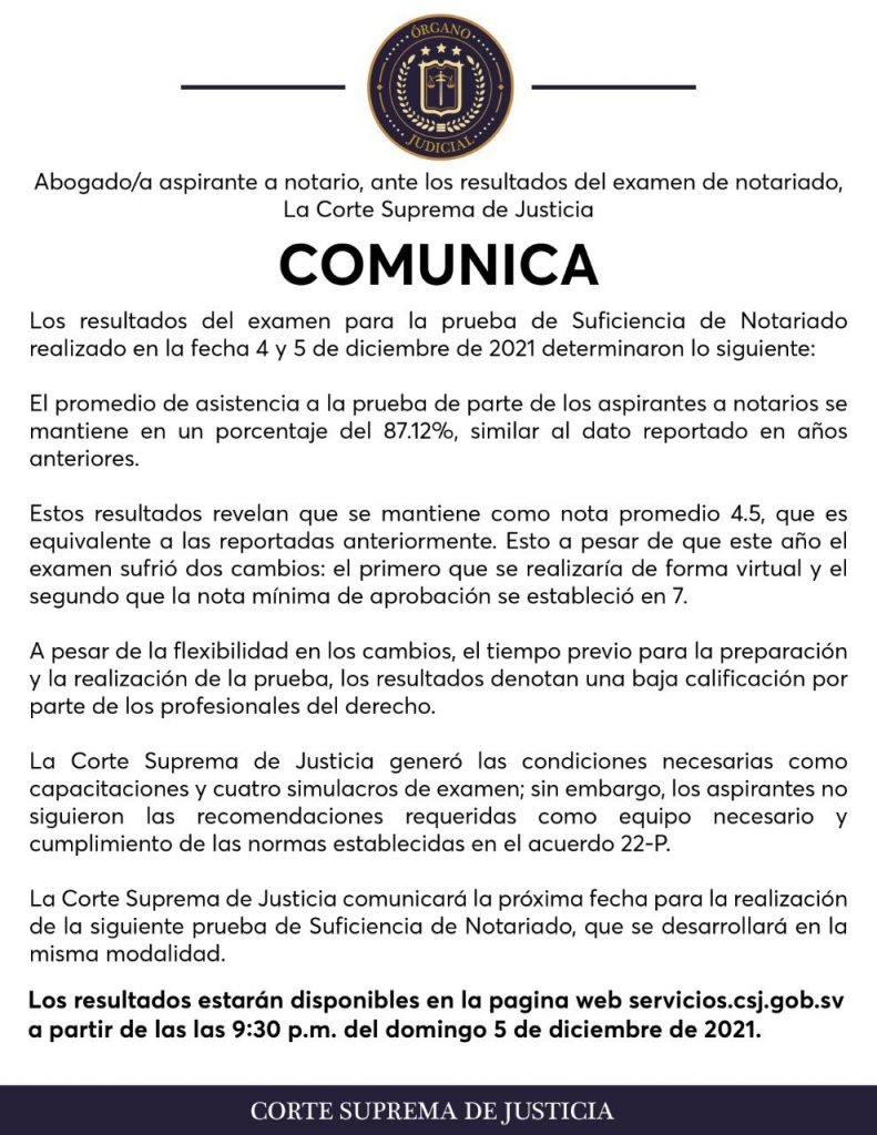 El examen que se realizó el 4 y 5 de diciembre en tres sedes asignadas y de manera virtual, la mayoría de aspirantes no logró superar la nota mínima de 7, en promedio la nota a nivel general fue de 4.5 de acuerdo a los resultados revelados la noche de este domingo por la CSJ.