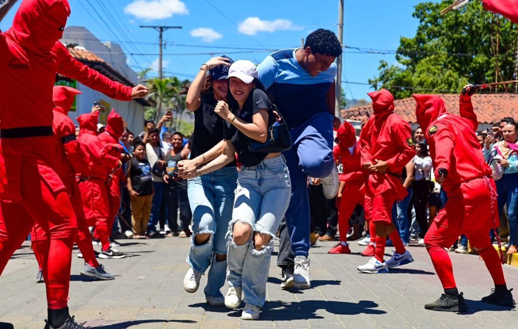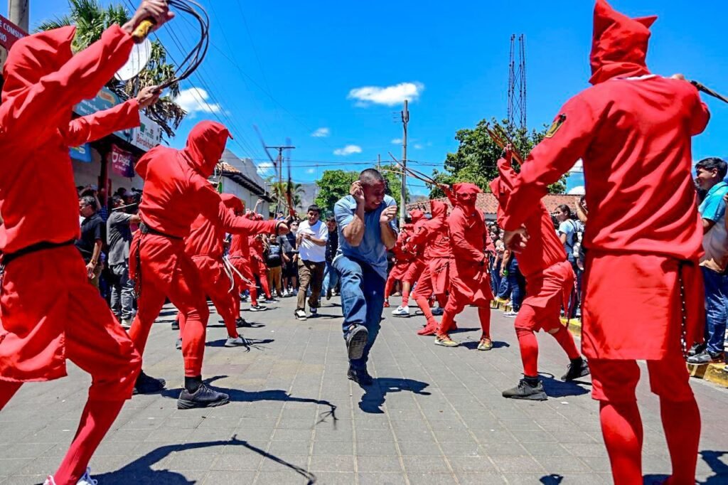El Salvador- Con trajes rojos, máscaras y riendas en mano, los Talcigüines representan a figuras que encarnan el mal, en una puesta en escena que, como explicó el párroco Hilario Morán, forma parte de una enseñanza basada en pasajes bíblicos.