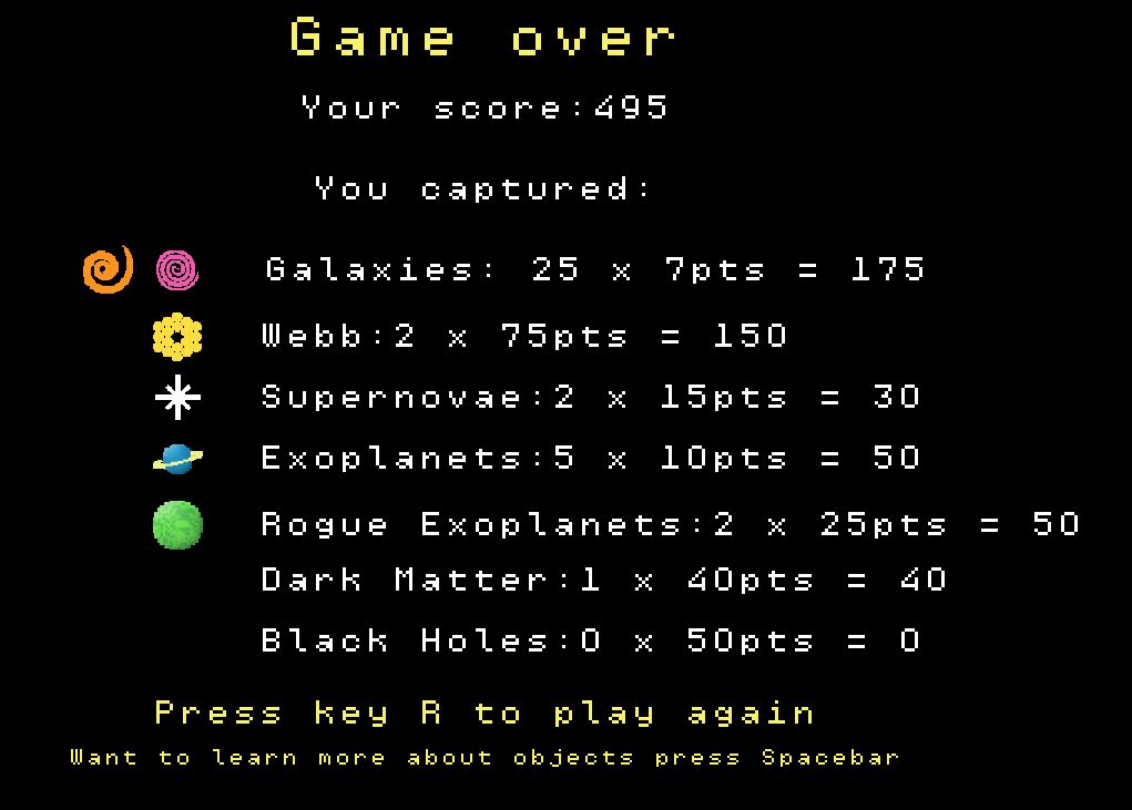 La idea es utilizar las teclas direccionales para moverte y con la barra espaciadora tomar una foto del elemento que aparece. Lo más fácil de capturar son los exoplanetas, pero las supernovas son las más difíciles de capturar porque aparecen de forma intermitente.