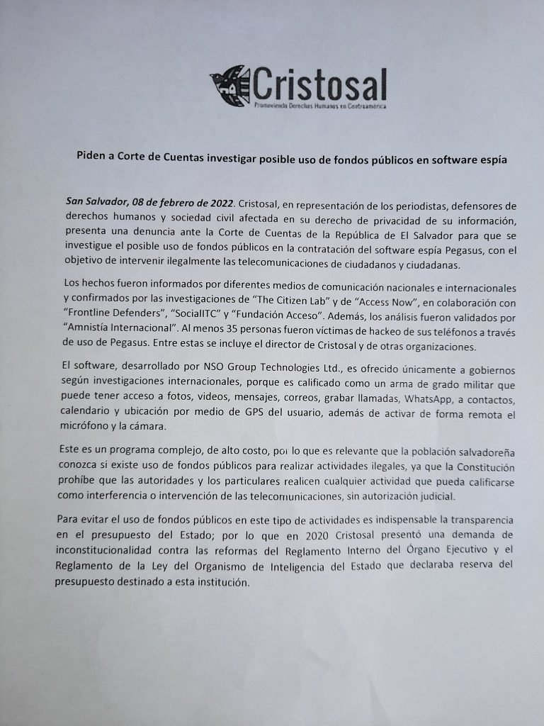 El Salvador – Representantes de la Organización de Derechos Humanos Cristosal, presentaron una denuncia ante la Corte de Cuentas de la República, para que se investigue el posible uso de fondos públicos en la contratación del software espía Pegasus, con el objetivo de intervenir ilegalmente las telecomunicaciones de los ciudadanos, entre ellos periodistas y dirigentes críticos al gobierno del presidente Nayib Bukele.