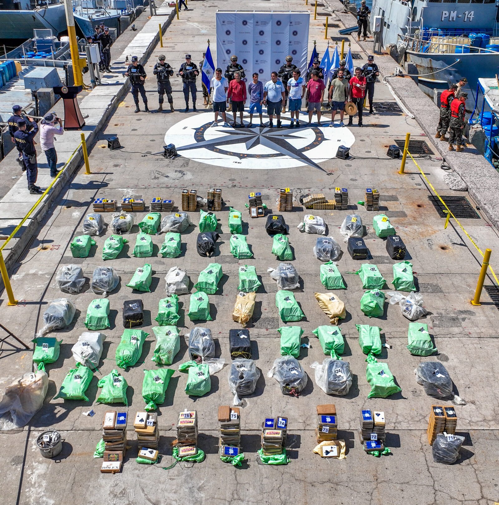 El Salvador – El Gabinete de Seguridad presentó la incautación de 1.5 toneladas de cocaína valorada en el comercio del narcotráfico en $39 millones de dólares, ubicada por la Fuerza de Tarea Naval Tridente de la Marina Nacional el pasado 27 de enero, a 300 millas náuticas (556 kilómetros), al suroeste de la Bocana El Cordoncillo, en el Estero de Jaltepeque.