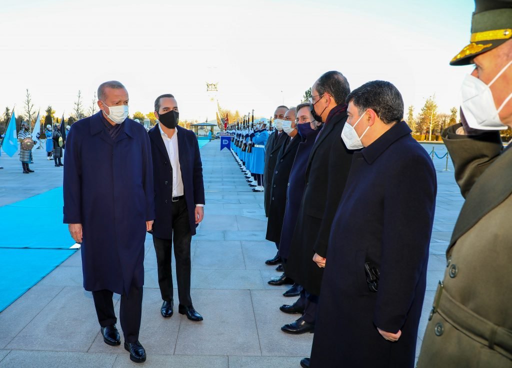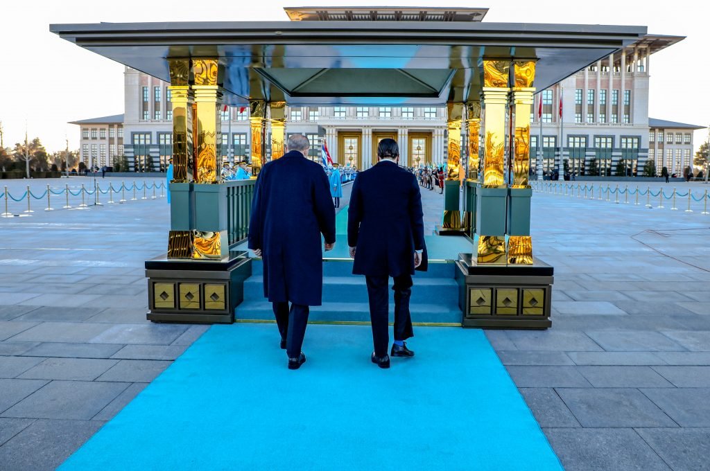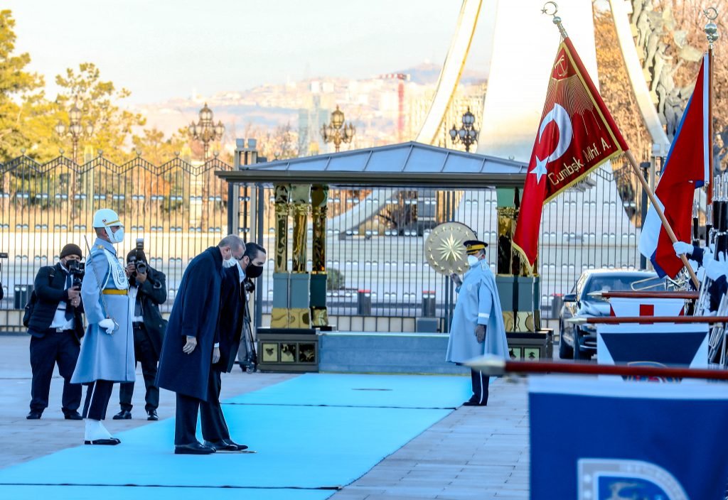 Ahí fue recibido por el Presidente de Turquía, Recep Tayyip Erdoğan. Ambos gobernantes recorrieron la plaza de ceremonias pasando revista a la guardia de honor.