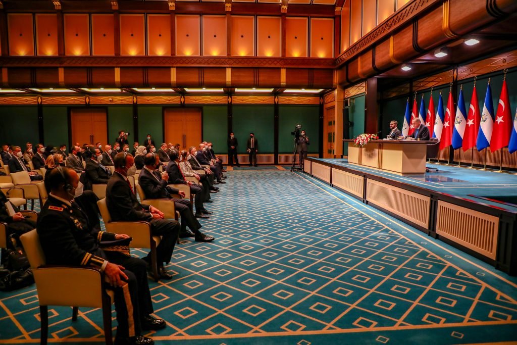 Posteriormente, los Presidentes Bukele y Erdoğan ingresaron a una reunión privada, y más tarde se incorporaron a la mesa donde ambas delegaciones daban los toques finales a los acuerdos que se firmaron este jueves.