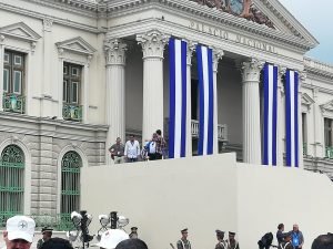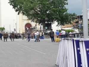 También, se instalaron las delegaciones oficiales, miembros del Batallón Presidencial, banda regimental de la Fuerza Armada, cámaras, grúas, cinco pantallas gigantes, drones, luces, equipo de audio y prensa nacional que desde las afueras monitoreó detalle a detalle el ensayo. Asimismo, hubo repique de campanas y se lanzaron disparos al aire.