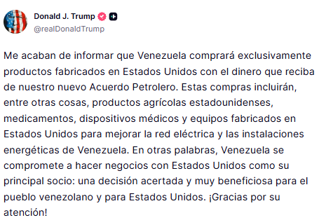 El presidente de EE.UU., Donald Trump, aseguró que Venezuela se comprometió a comprar «exclusivamente» productos fabricados en su país, con el dinero que resulte de su nuevo acuerdo petrolero.