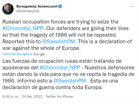 El presidente de Ucrania, Volodímir Zelenski, confirmó que Rusia invadió la zona de exclusión nuclear de Chernobyl. Explicó que las fuerzas de seguridad que protegen la zona se encuentran combatiendo las tropas que fueron enviadas por el presidente ruso, Vladimir Putin.